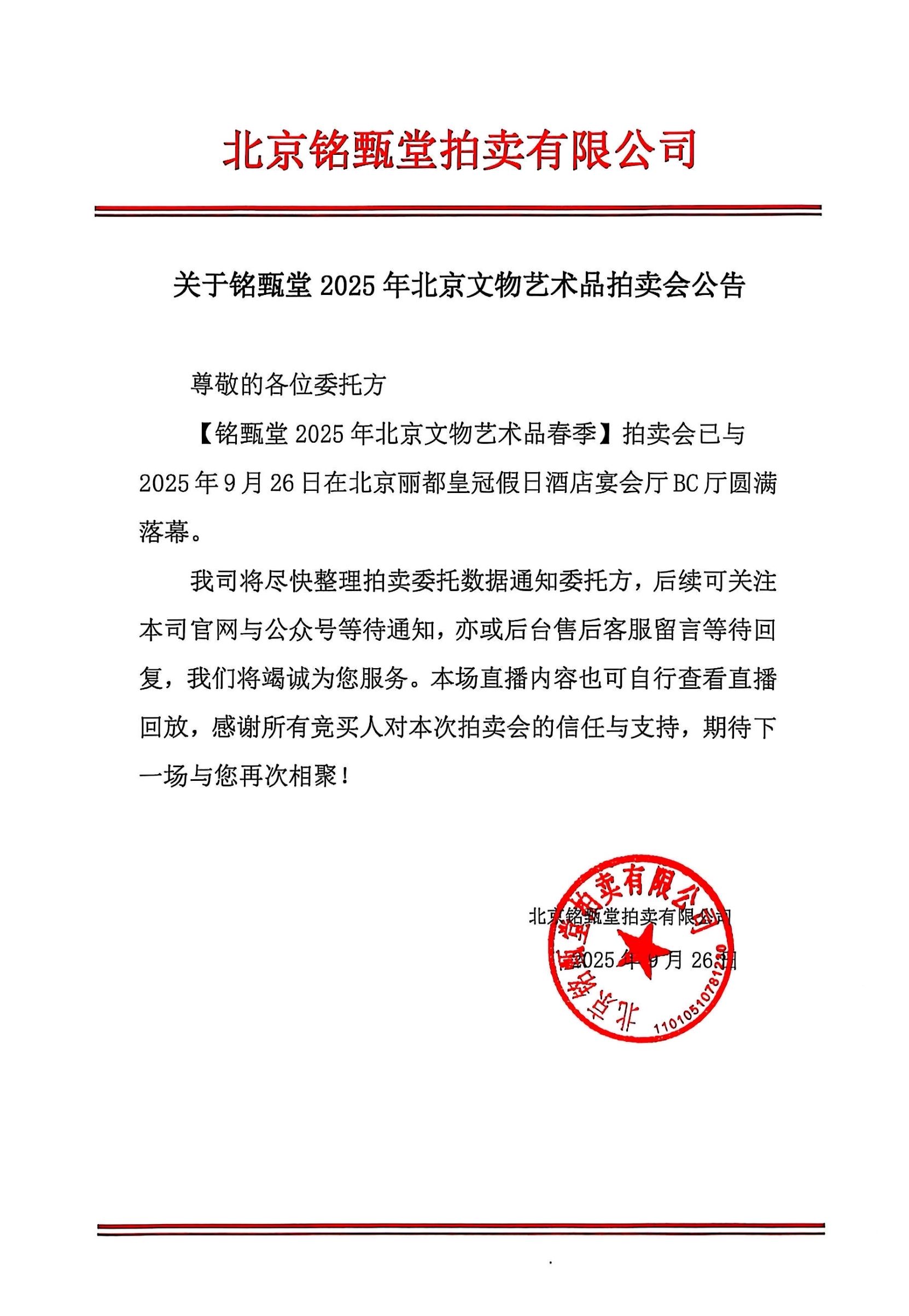 关于御铭堂2025年北京文物艺术品拍卖会公告