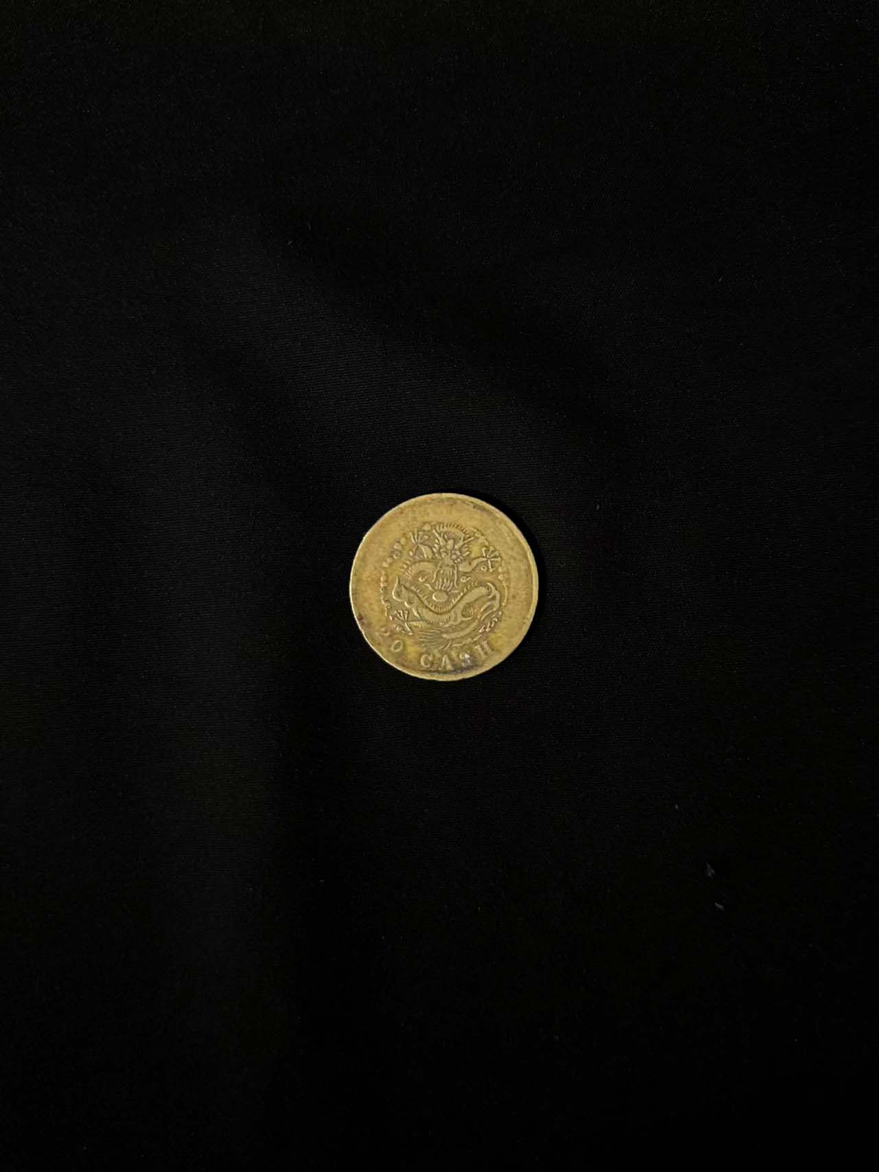正面中央珠圈内镌 “光绪元宝” 四字,以魏碑体楷书镌刻,笔锋刚劲。珠圈外上方铸 “户部” 字样,下方标注 “当制钱二十文”,左右分列小花饰。背面为蟠龙图案,龙首正视,五爪张开,龙身盘踞祥云间,下方缀火焰珠,龙纹雕刻精细。龙图外环英文,上方为 “HU POO”,下方为 “20 CASH”,字母间距均匀,展现出较高的冲压精度。